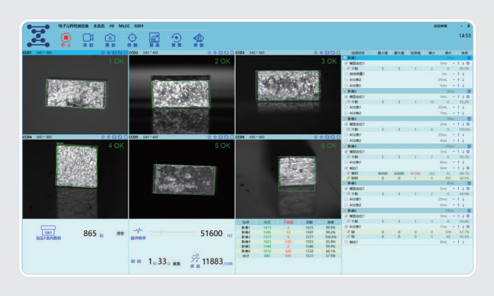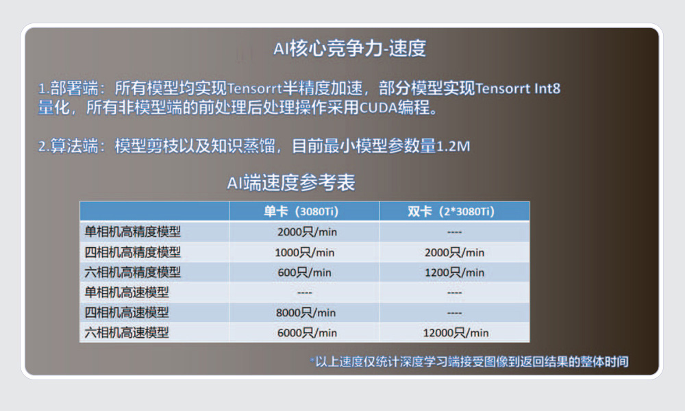 模型压缩以及综合部署加速,在高速场景下支持六相机节拍 12000 只 /min 以上。